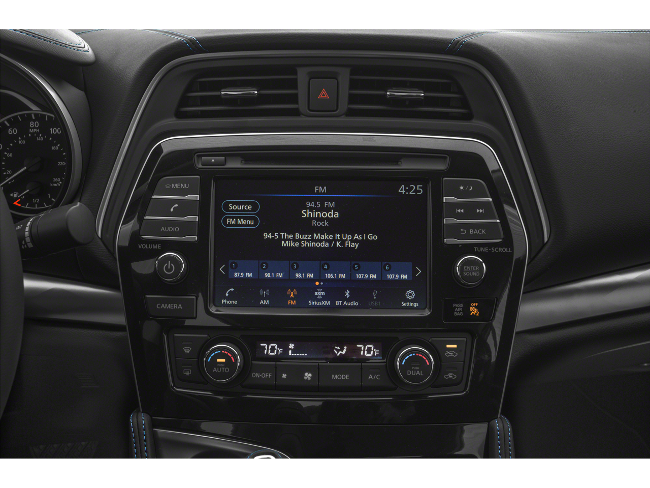 - Radio: AM/FM/CD Audio System w/Navigation -inc: MP3/WMA reader, 8 speakers, NissanConnect w/navigation featuring Apple CarPlay and Android Auto, 8" color display w/multi-touch control, 2 front illuminated USB connection ports (1 Type-A, 1 Type-C) for iPod interface and other compatible devices, Bluetooth® hands-free phone system, streaming audio via Bluetooth®, hands-free text messaging assistant, SiriusXM satellite w/advanced audio features, auxiliary audio input jack, Nissan door to door navigation w/3D building graphics and satellite imagery, connected navigation features including online POI search, door-to-door navigation, and online premium traffic information, HD radio, SiriusXM Travel Link (weather, fuel prices, movie listings, stock info, sports and parking) and SiriusXM Traffic